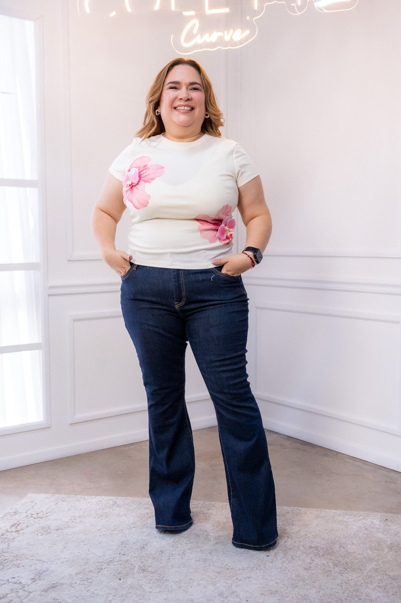 Jeans de mezclilla stretch corte campana y cintura alta. La perfecta fusión entre casual y moderno.