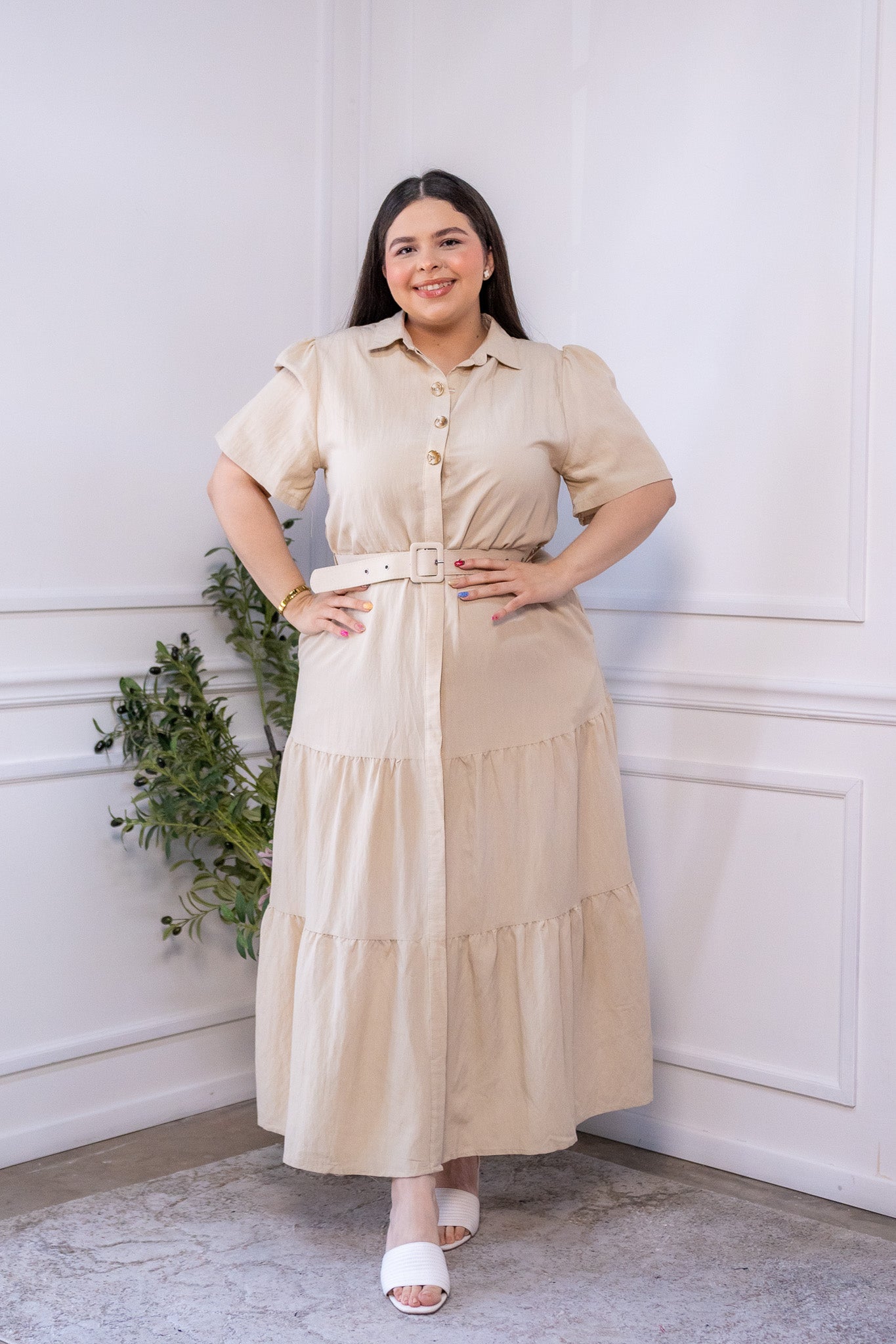 Maxi vestido camisero liso beige